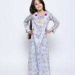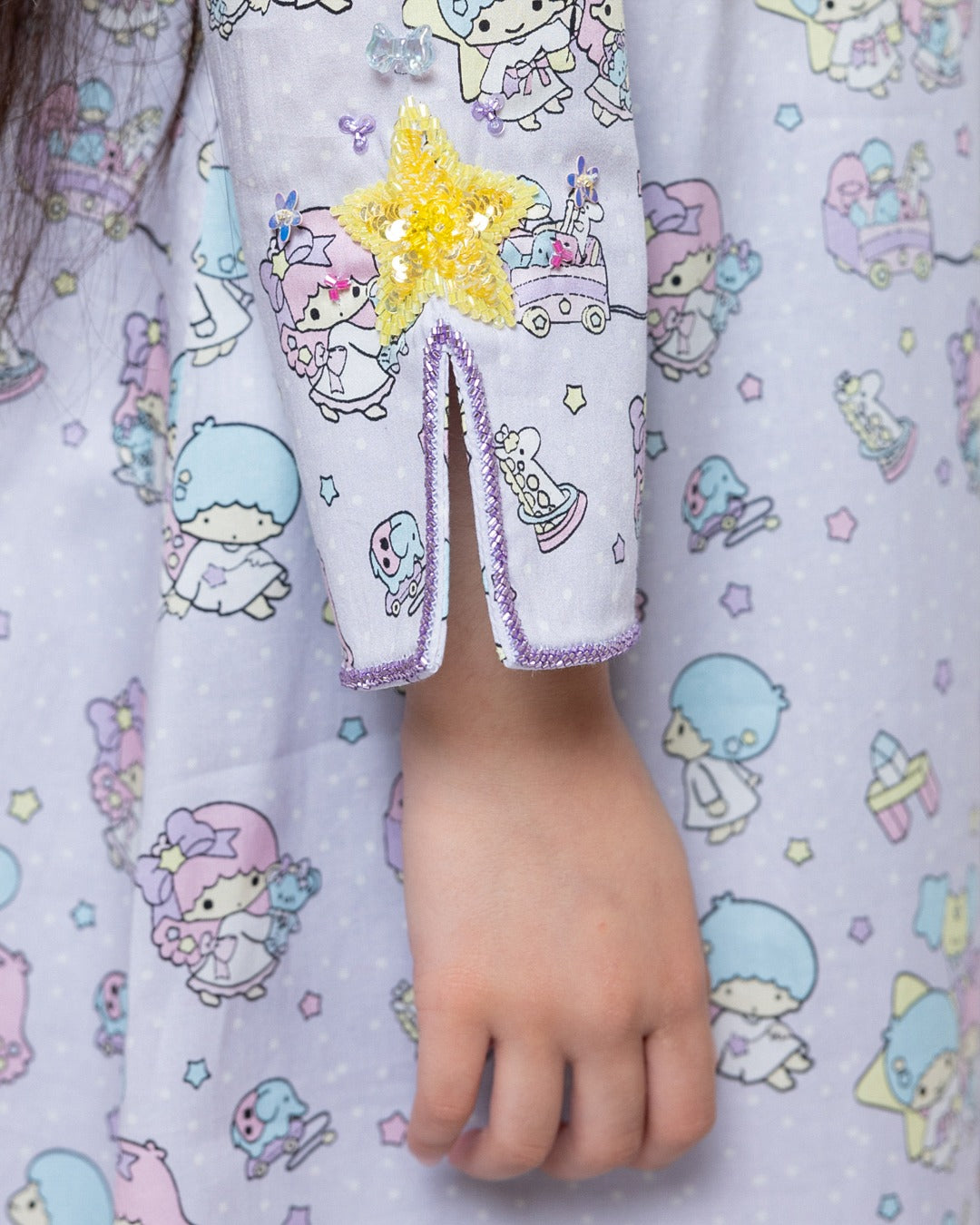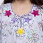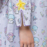 Pastel character-print dress with shimmering star details.