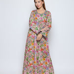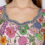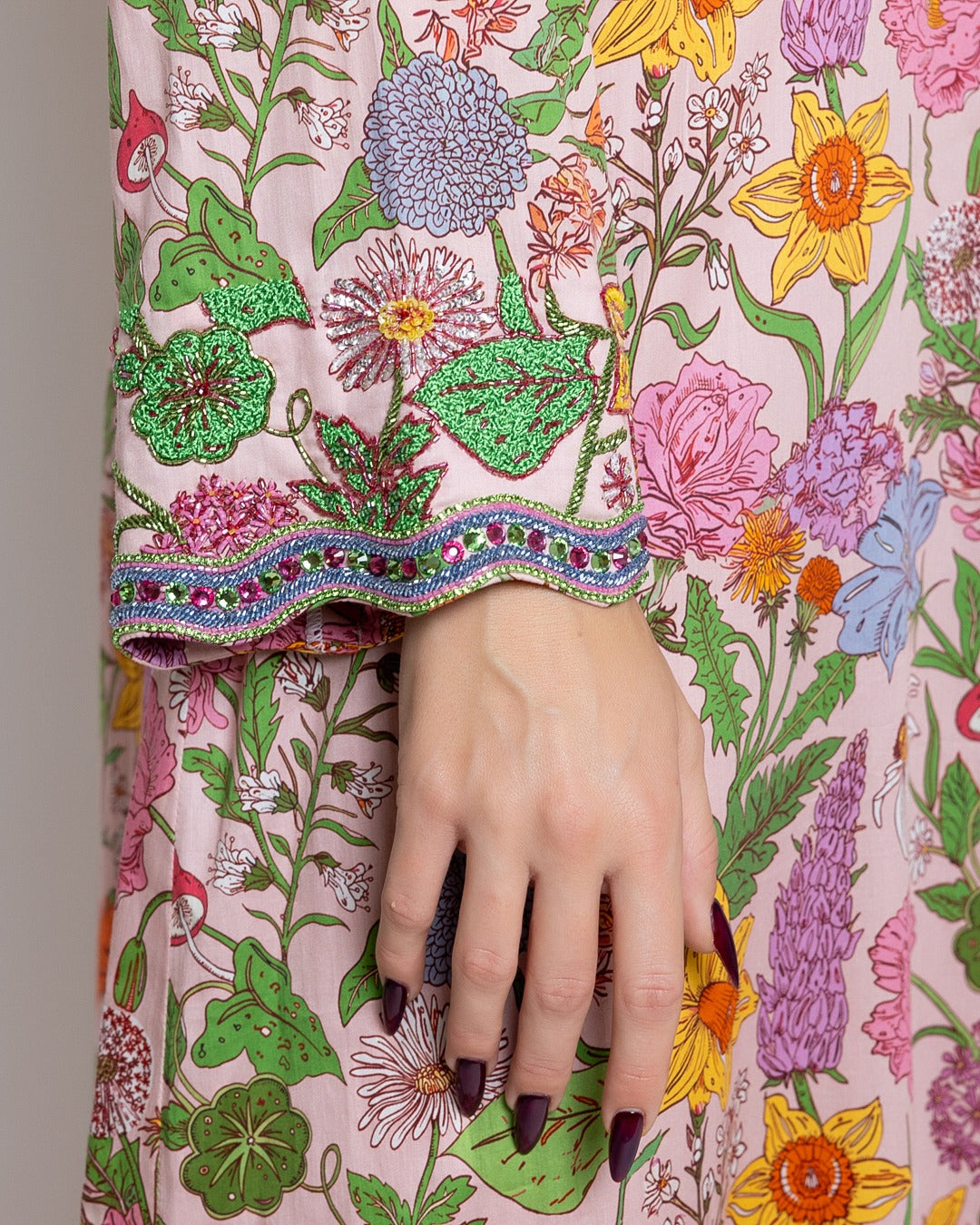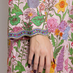 Crafted from soft cotton with a delicate botanical print, finished with hand-embellished neckline and cuffs.